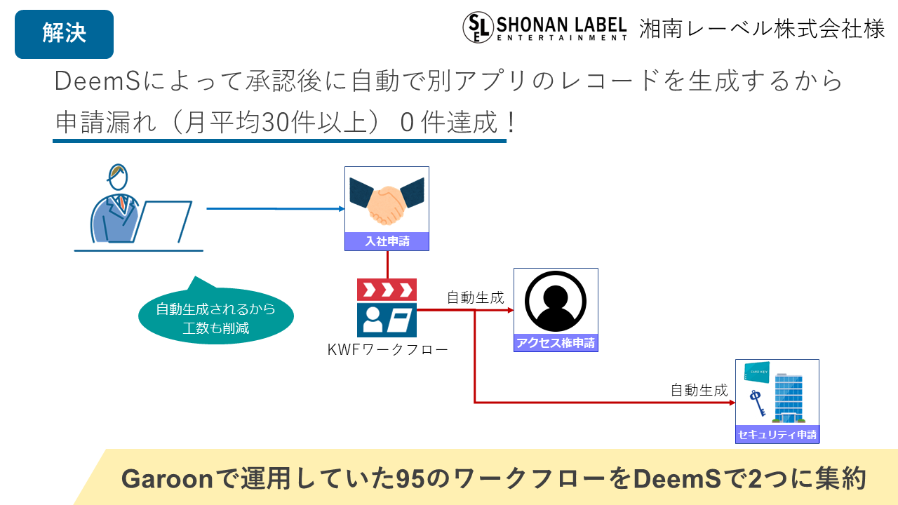 ワークフロー承認後、別アプリのレコードを自動で生成する機能が「DeemS」でリリースされた事によって、入社申請や異動申請に関連して必要なアクセス権申請やセキュリティ申請の申請漏れが無くなった