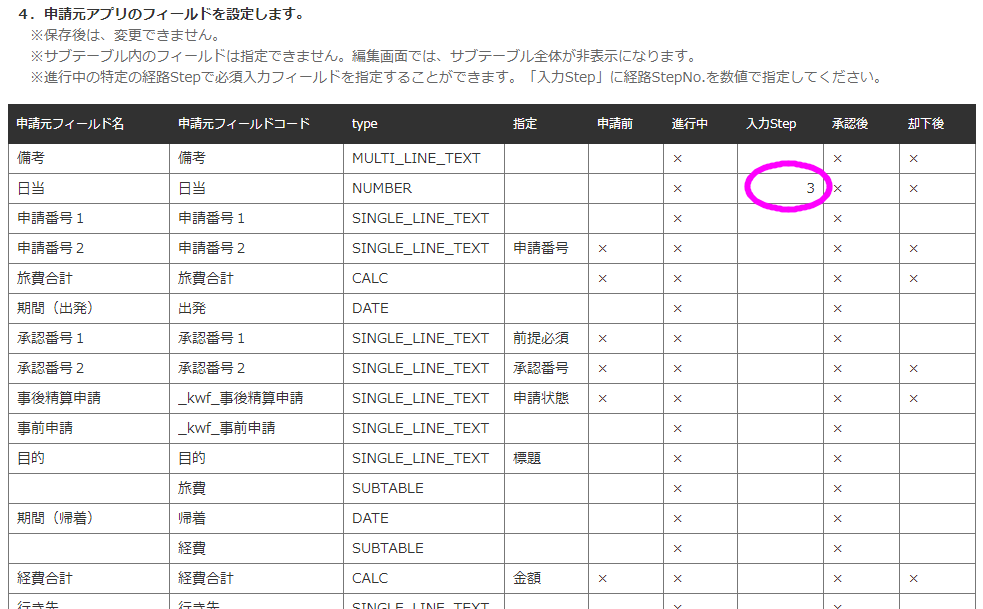 すべてのフィールドに対して、申請前・進行中・承認後・却下後の各ステータスごとに編集可・不可の選択が可能です。