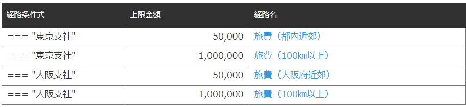 申請元レコードの金額や文字列、日付フィールド等の値を元に、経路条件式に合致した承認経路を自動適用します。
