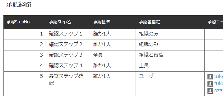 承認経路は複数のステップを設定できます。「上長」、「グループ」、「組織」、「組織とその役職」、「ユーザー指定」を指定することができます。次のステップに進む条件として、誰か1人または全員承認(複数承認)の種別を指定できます。
