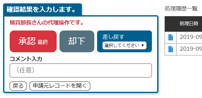代理承認者による承認・却下・差し戻しの操作が可能です。代理承認者は、ユーザープロフィール項目で指定できます。