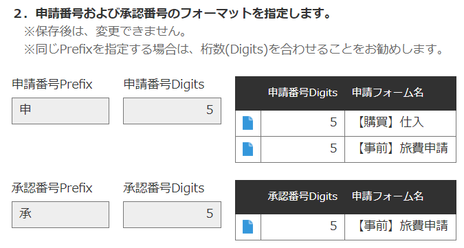 申請番号と承認番号のプレフィックスや桁数を指定できます