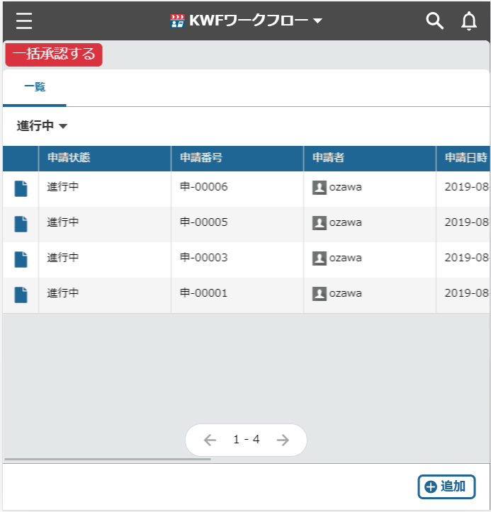 申請元アプリからの申請および承認、却下、差し戻しが可能です。また、一括承認もできます。