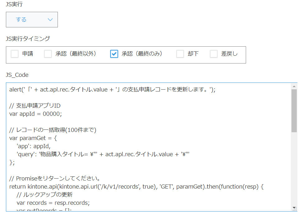承認後にJavaScriptを実行可能です。承認のタイミングも指定可能です。